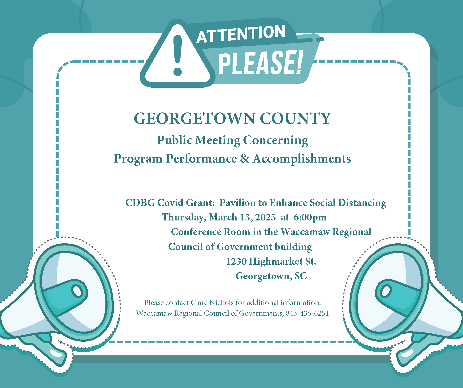 The Citizen Participation Plan and the application are available for review at Waccamaw Regional Council of Governments (Monday-Friday 9am-5pm). Persons with questions or comments concerning the public hearing or the Citizen Participation Plan may contact Clare Nichols, Grant Administrator, Waccamaw Regional Council of Governments, 1230 Highmarket Street, Georgetown, SC 29440 or call (843) 436-6251.