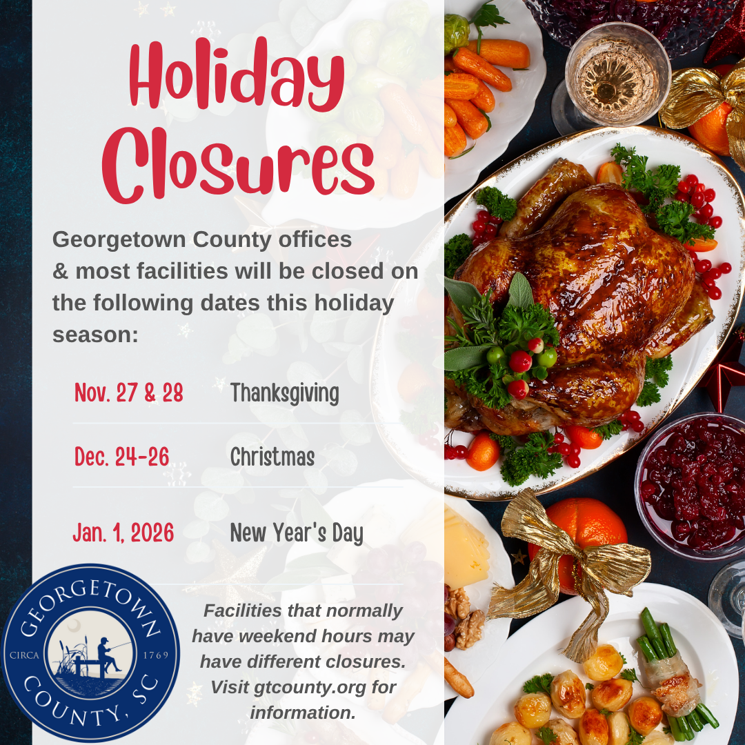 Georgetown County offices and most county-operated facilities will observe several closures during the upcoming holiday season. Residents are encouraged to plan ahead for office visits, landfill trips, and recycling center drop-offs. Holiday closures are as follows.