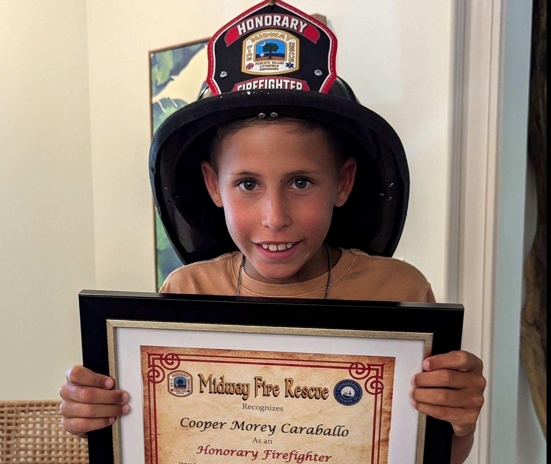 Cooper’s calm and quick thinking saved the family – action for which he was recognized this week. Officials from Midway Fire-Rescue visited the Caraballos at their home on July 23 to make Cooper an honorary firefighter with the department, and present him with a service helmet and shield, along with a framed department patch and coin. Decker also got a framed patch and coin.