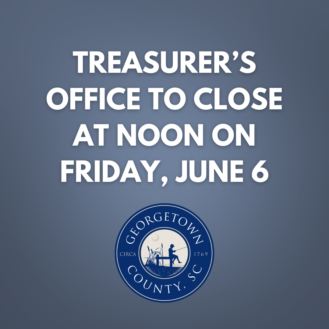 The Georgetown County Treasurer's Office will close early this Friday, June 6, for additional work following last week's water leak. The office will close at noon Friday and should return to normal operations the following Monday. We apologize for any inconvenience.